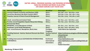 Fakultas Ekonomi dan Bisnis Islam (FEBI) UIN Sunan Gunung Djati Bandung kembali menambah sekaligus memperbarui daftar jurnal terkareditasi nasional. Beberapa jurnal yang berada di bawah pengelolaan FEBI yang baru saja mengumumkan hasil akreditasinya di antaranya : Journal of Islamic Economics and Business (JIEB) dengan akreditasi Sinta 2, Jurnal Ilmu Akuntansi dan Bisnis Syariah (AKSY) dengan akreditasi Sinta 3, Jurnal of Sharia Financial Management (Finansha) dengan akreditasi Sinta 3, Jurnal Manajemen dan Bisnis (Branding) dengan akreditasi Sinta 4, dan Jurnal Pengabdian kepada Masyarakat Bidang Ekonomi dan Bisnis (Prestise) dengan akreditasi Sinta 4. Pencapaian ini tidak lepas dari kerja keras tim editorial di bawah pimpinan Editor in Chief beserta dukungan dari seluruh civitas academica FEBI. Berikut daftar jurnal di FEBI beserta akreditasinya :